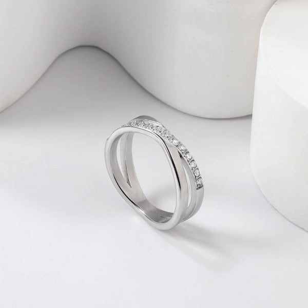De vloeiende, golvende vorm omlijst een rij fonkelende zirkonia's die symbool staan voor oneindige schoonheid. Deze ring is vervaardigd uit duurzaam stainless steel met een luxueuze vergulde zilverkleurige afwerking, perfect als stijlvol cadeau of als verfijnd detail bij elke outfit.