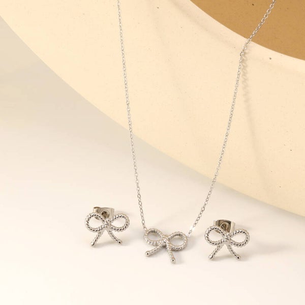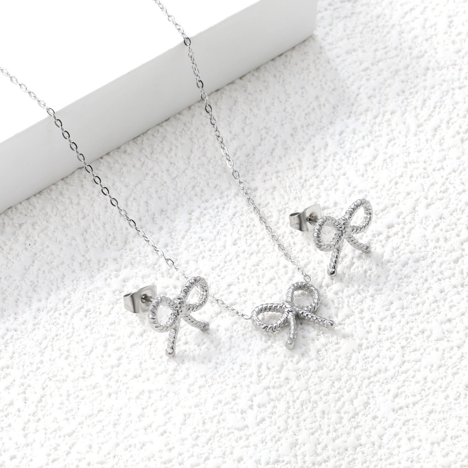 De Silver Bow Charm Set is een speels maar elegant duo van een verfijnde ketting en bijpassende oorbellen. Gemaakt van hoogwaardig roestvrij staal straalt deze set tijdloze charme en klasse uit.