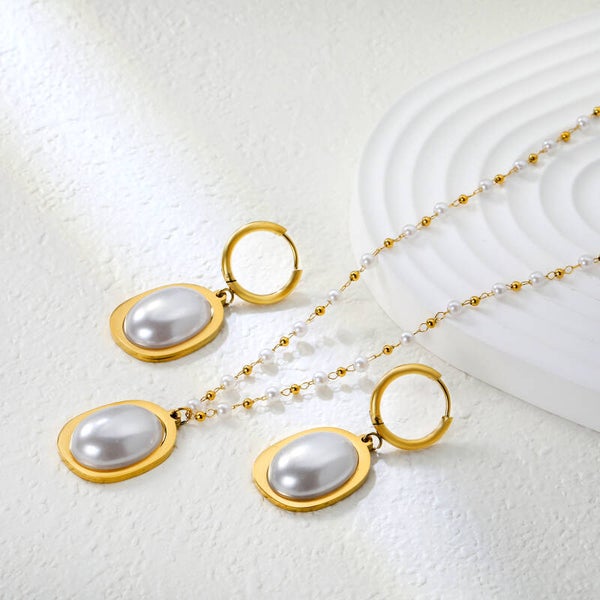 De Aurora Pearl Set combineert klassieke elegantie met moderne luxe. Deze schitterende set bestaat uit een ketting en oorbellen, vervaardigd uit hoogwaardig roestvrij staal en afgewerkt met een duurzame laag PVD 18K goud.