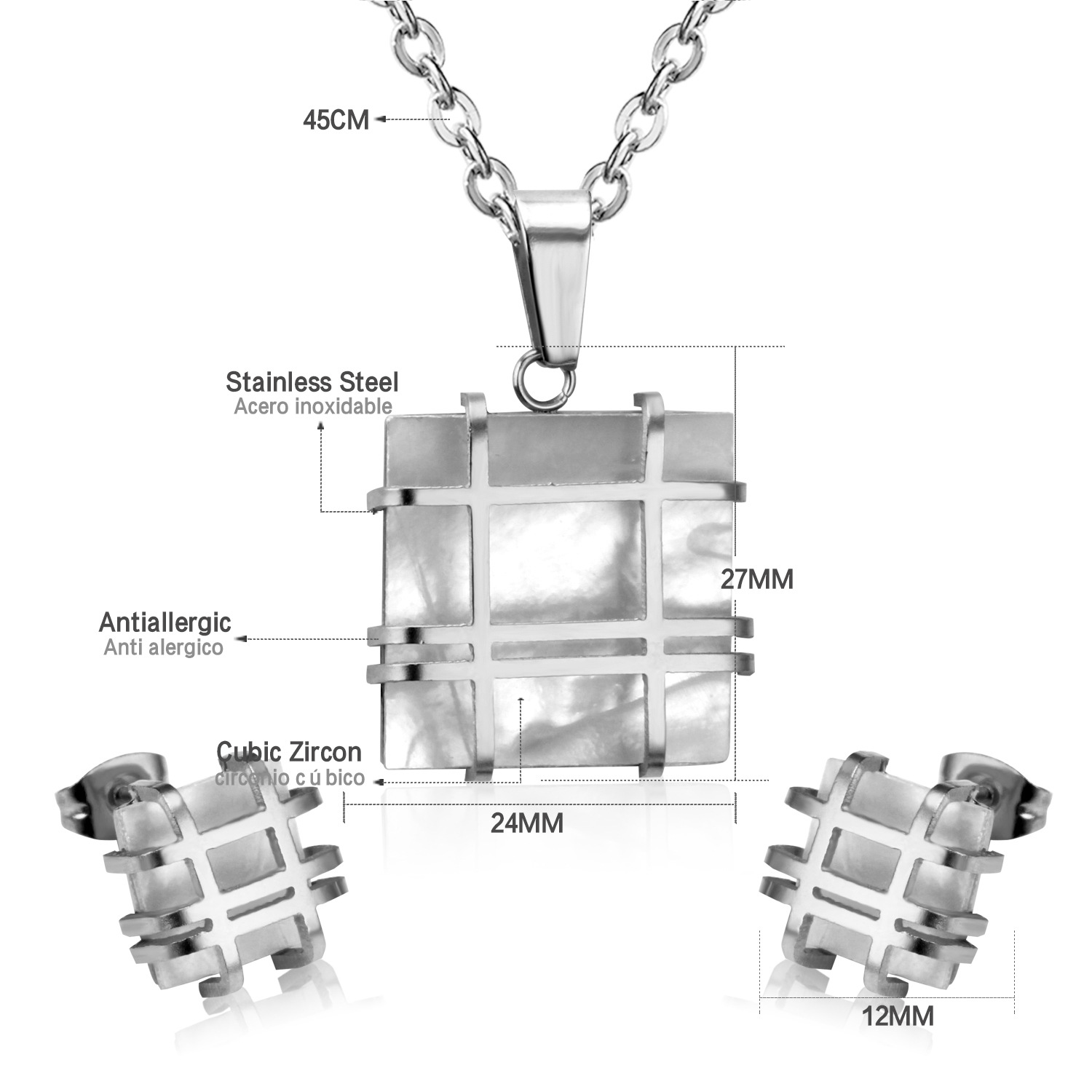 Zilveren sieraden set vierkant ketting + oorbellen | Roestvrij staal | Parelmoer | Luxe modern design