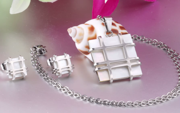 Elegante sieradenset met vierkante hanger en oorbellen, afgewerkt met glanzende parelmoer en een strak geometrisch design.