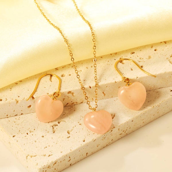 Roze hart sieraden set ketting + oorbellen | Roestvrij staal | PVD 18K goud | Rozenkwarts
