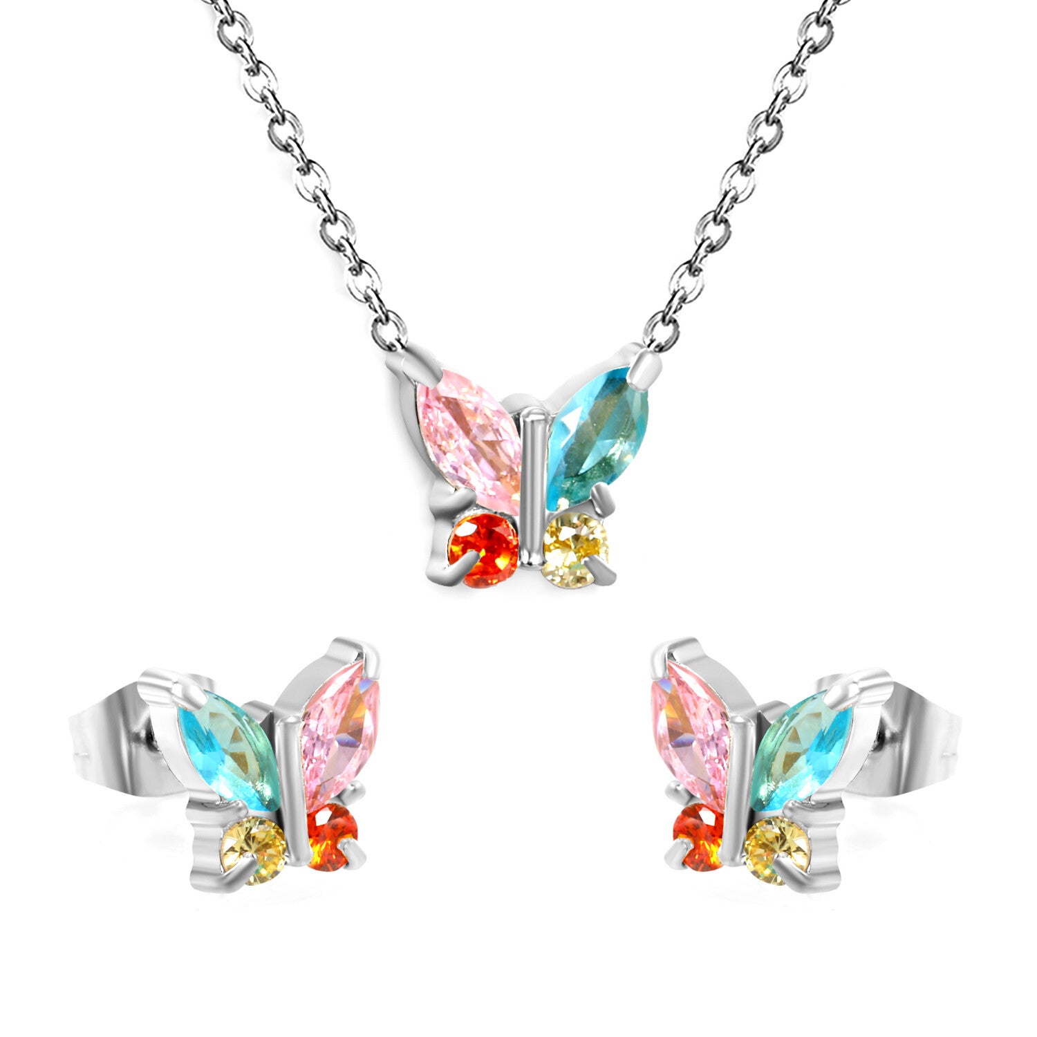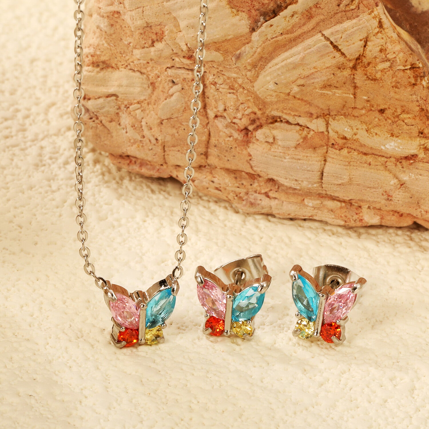 ✨ Prachtige sieradenset bestaande uit ketting en oorbellen met kleurrijke vlinder hanger. Gemaakt van hoogwaardig roestvrij staal en bezet met fonkelende zirkoon stenen.