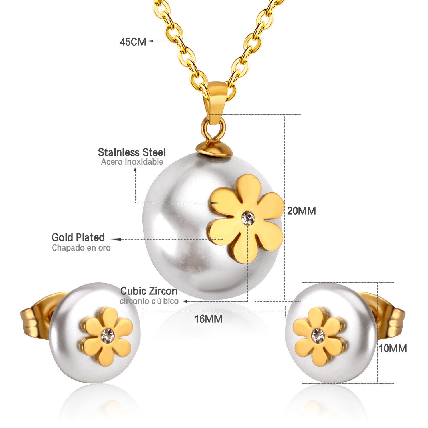 💎 Gemaakt van roestvrij staal met duurzame PVD 18K goud plating 💎 Unieke combinatie van glanzende parel en gouden bloem met fonkelend detail