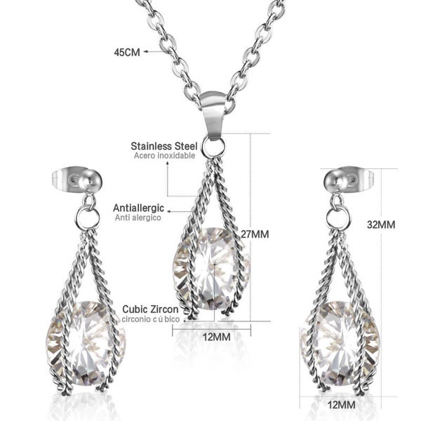 Ketting & oorbellen set zilver roestvrij staal druppel design met zirkoon steen