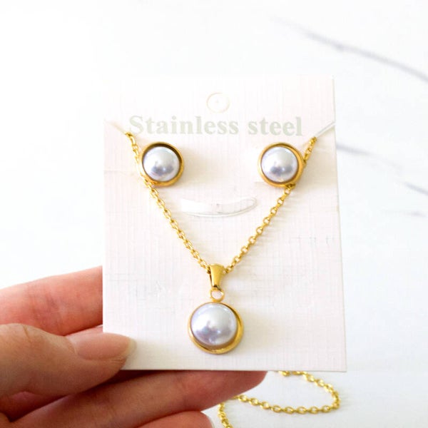 Gouden sieraden set ronde parel ketting + oorbellen | Roestvrij staal | PVD 18K goud | Parel look