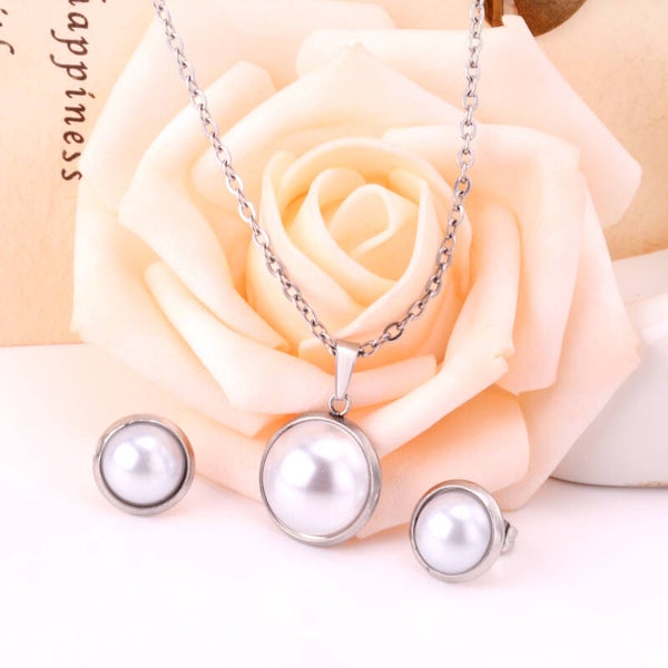 Zilveren sieraden set ronde parel ketting + oorbellen | Roestvrij staal | Parel look